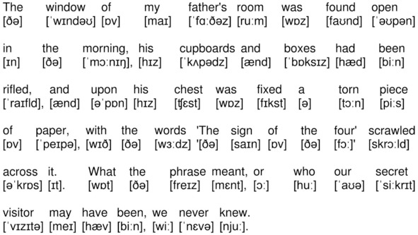 The window of my father’s room was found open in the morning, his cupboards and boxes had been rifled, and upon his chest was fixed a torn piece of paper, with the words «The sign of the four’ scrawled across it. What the phrase meant, or who our secret visitor may have been, we never knew.