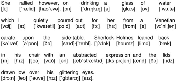 She rallied however, on drinking a glass of water which I quietly poured out for her from a Venetian carafe upon the side-table. Sherlock Holmes leaned back in his chair with an abstracted expression and the lids drawn low over his glittering eyes.