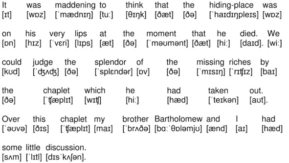 It was maddening to think that the hiding-place was on his very lips at the moment that he died. We could judge the splendor of the missing riches by the chaplet which he had taken out. Over this chaplet my brother Bartholomew and I had some little discussion.
