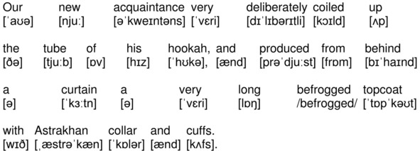 Our new acquaintance very deliberately coiled up the tube of his hookah, and produced from behind a curtain a very long befrogged topcoat with Astrakhan collar and cuffs.