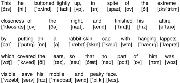 This he buttoned tightly up, in spite of the extreme closeness of the night, and finished his attire by putting on a rabbit-skin cap with hanging lappets which covered the ears, so that no part of him was visible save his mobile and peaky face.