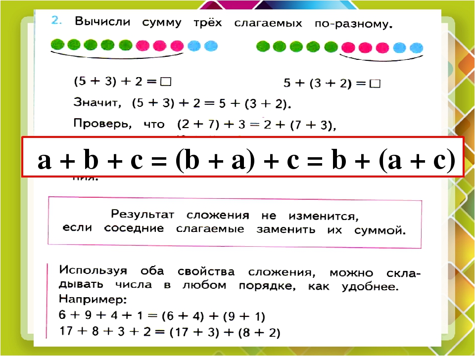 3) знание сочетательного свойства сложения и правила вычитания числа из суммы;