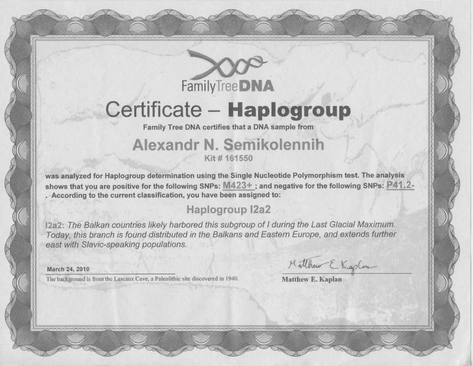 Перевод: Данный документ удостоверяет, что анализ ДНК Семиколенных А. Н. на предмет определения гаплогруппы с использованием теста Single Nucleotide Polimorphism (досл. полиморфного одноядерного) показывает положительную корреляцию со SNP M423+ и отрицательную со SNP Р41.2.
