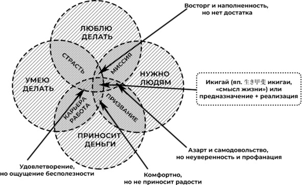 Конечно, понятие «икигай» гораздо многограннее и глубже, чем показано на схеме. Ему посвящены книги, ведь это своего рода целая философия отношения к жизни, себе, другим людям, событиям.