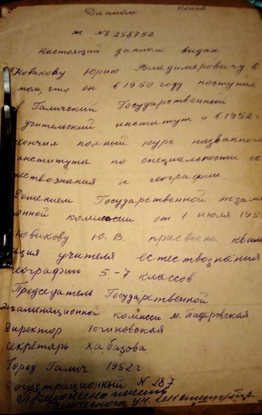 С младых лет родители приучили его к труду (дома в то время, как и в домах других жителей, держали многочисленную живность). Имея исключительный музыкальный слух, он рано научился играть на музыкальных инструментах. Особенно ему нравилось играть на гармошке. Да и было в кого: отец учился в Костромской духовной семинарии и имел уникальный голос, в церковном хоре пробовал партии баса, основным голосом был баритон, не брезговал тенором и иногда брал ноты дисканта даже в значительном возрасте, а дед его, священник погоста Рождества Богородицы Александр Алексеевич Новиков, тоже студент Костромской духовной семинарии в прошлом, имел бас-баритон и был в окормляемых им церковно-приходской школе села Скоробогатово и двухклассном училище села Завражье законоучителем и преподавателем пения. По окончании Солтановской школы Юрий Владимирович поступил в сельскохозяйственный техникум на агронома – плодоовощевода. Получив образование и поработав совсем немного в колхозе по специальности, попробовал свои силы в поступлении в Ярославский медицинский институт. Его знания химии приёмную комиссию в полной мере не удовлетворили, и Юрий поступил в Галичский учительский институт на естественно-географический факультет. По окончании института начал работать учителем естественно-научных дисциплин в Нижне-Нейской школе.