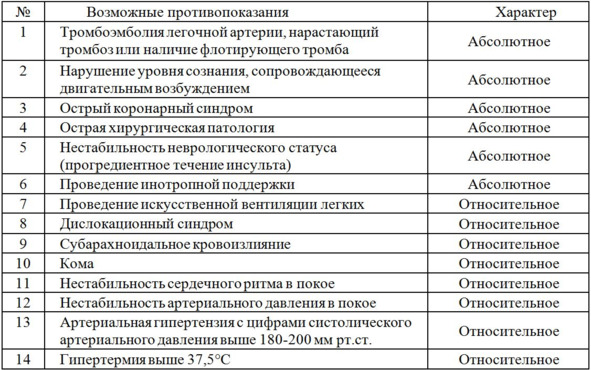 Все противопоказания к вертикализации разделены на абсолютные и относительные по степени обязательности их соблюдения (таб. 1). Во всех сомнительных случаях рекомендуется принимать решение о проведении процедуры пассивной вертикализации коллегиально, с привлечением реаниматолога, невролога, терапевта и врача ЛФК.