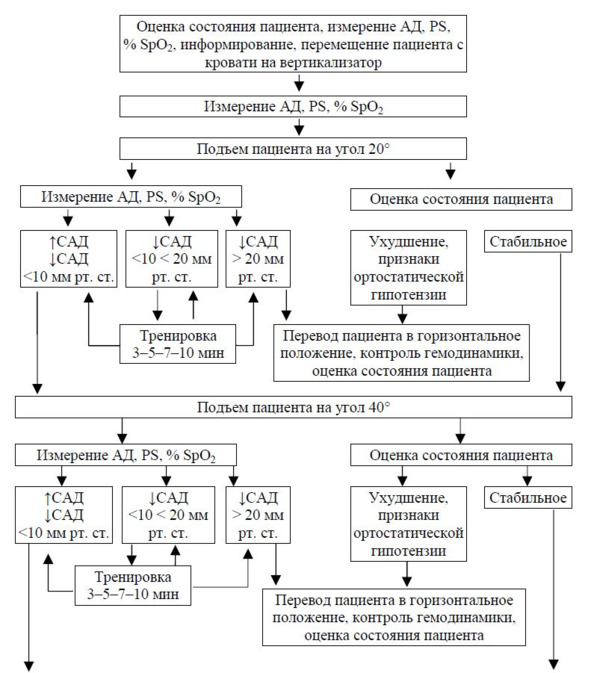 Перевод пациента из вертикального положения в 20° в вертикальное положение на 40° также сопровождается контролем АД, ЧСС и сатурации крови.