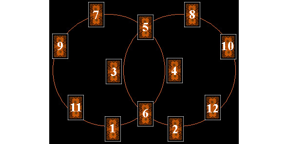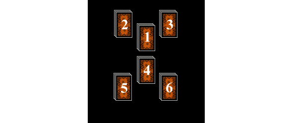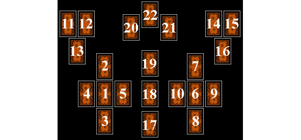 Карты тщательно перемешиваются и раскладываются рубашками вверх по порядку приведенной схемы на шесть кучек, в каждой по 13 карт. Затем открывайте карты в том же порядке, убирая, как при пасьянсе, карты одной масти или одного значения (номера или парные королевские) до появления карты Старшего Аркана.