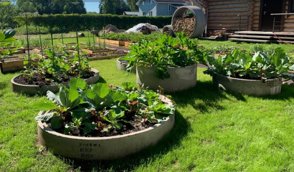 Интересным решением является использование в качестве «грядок» бетонных колец. Они бывают разной высоты и разного диаметра, что позволяет составлять из них оригинальные композиции. В таких кольцах прекрасно себя чувствуют бахчевые культуры: тыквы, патиссоны, кабачки, огурцы, успешно можно выращивать и томаты, капусту, фасоль, горох. Изнутри стенки бетонного кольца можно ничем не обрабатывать, ведь они рассчитаны на контакт, как с грунтом, так и с водой. Снаружи кольца можно покрасить или облицевать любым отделочным материалом.