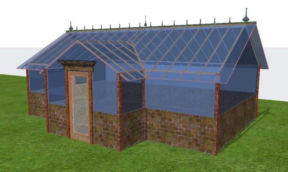 Наиболее сложная, но и интересная форма у так называемых Английских теплиц. Они могут стать украшением не только огорода, но и всего участка. Сама конструкция такой теплицы предполагает установку дополнительного оборудования, которое облегчит труды по выращиванию растений. Английские теплицы, как правило, предполагают наличие приподнятого цоколя. Фундамент делаем ленточный и цоколь на 0,5-1 м выше уровня земли. Снаружи фундамент и цоколь необходимо утеплить пеноплексом.