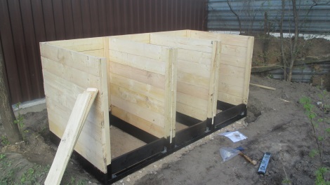 Лицевая сторона не зашивается, для нее делаем доски чуть меньшего размера, чем ширина отсека так, чтобы их можно было вставлять изнутри. По мере заполнения можно будет добавлять ряды досок, а потом расходуя перегной – снимать. Это позволяет облегчить доступ к содержимому отсека.