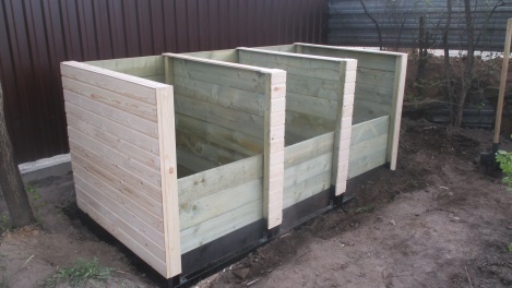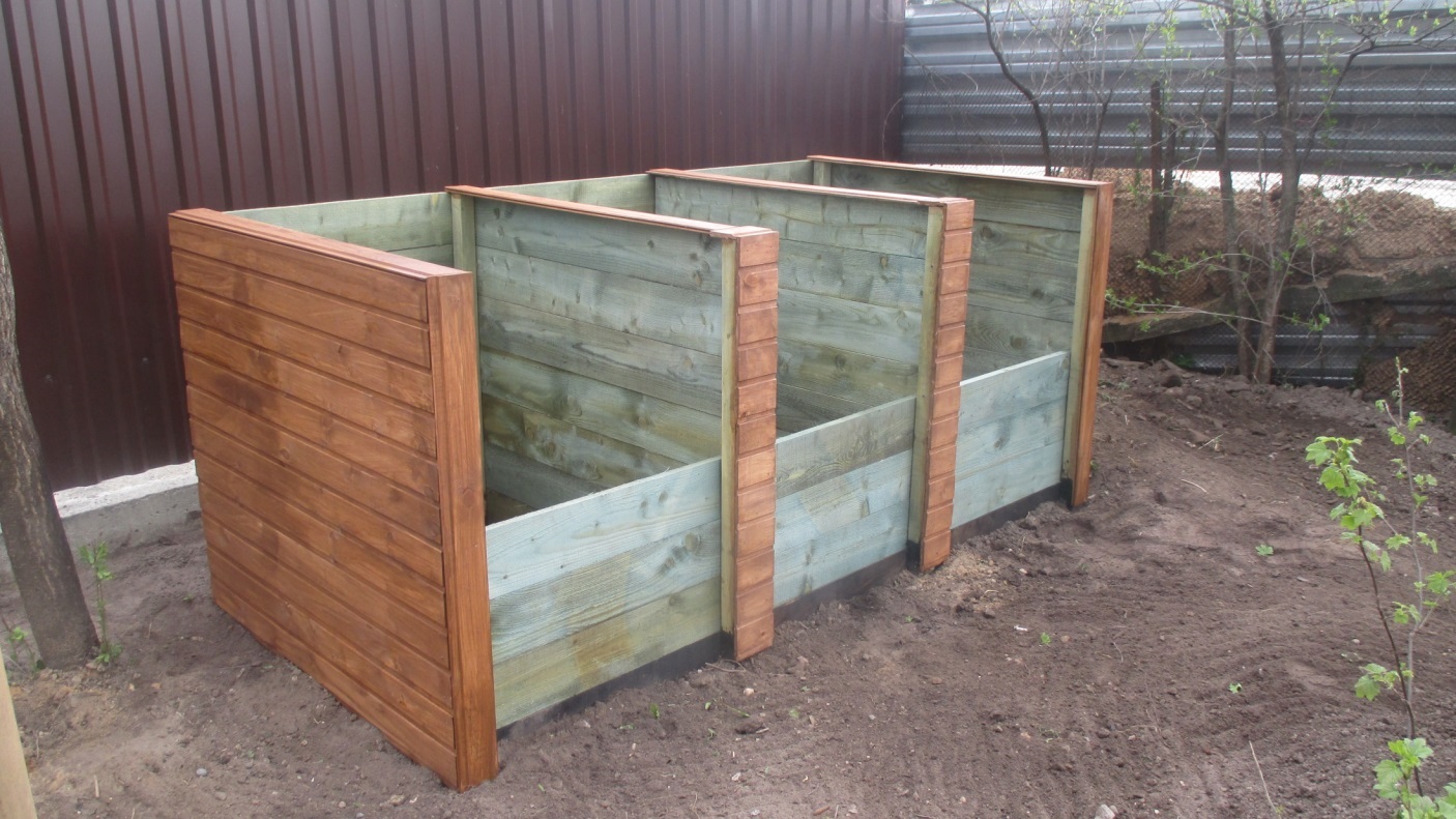 На основание размещаем каркас из деревянного бруса, обработанный битумной мастикой. Между собой соединяем на уголки. С интервалом в 1 м крепим на каркас вертикальные столбы из того же бруса высотой 1 м. С трех сторон и между отсеками облицовываем досками с небольшими зазорами. С видовых сторон можно облицевать более декоративным вариантом: вагонкой или блокхаусом. Все деревянные элементы пропитываем антисептиком, а поверх можно дополнительно обработать лаком с колером или краской. Конечная отделка выполняется в соответствии со стилистикой зоны, в которой будет установлен компост.