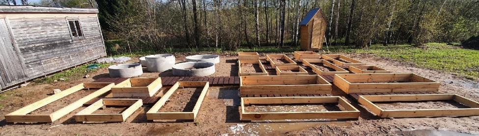 Компост можно создать своими руками из простых материалов достаточно быстро. Для участка площадью в 10-15 соток достаточно объема в 3 отсека по 1 куб.м каждый. В начале делаем углубление в грунте на 20-25 см. В случае глинистого основания, можно сразу приступать к монтажу конструкции, а в отсутствии глины, засыпаем ее в основание созданного углубления. Сверху застилаем геотекстиль.