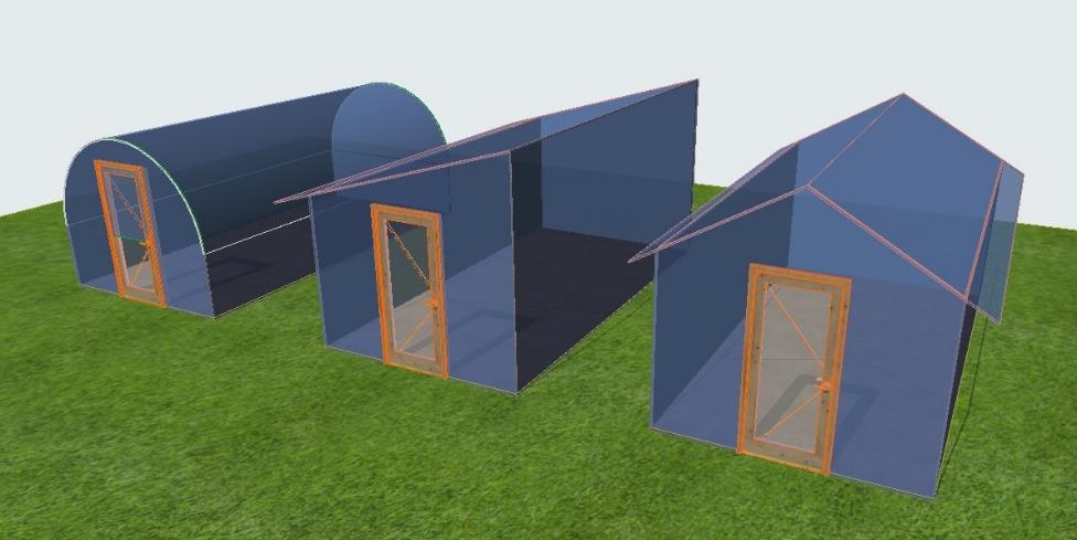 При выборе формы теплицы стоит ориентироваться на выбранную планировку всего огорода. Если присутствуют округлые формы, к ним подойдет полукруглая теплица из поликарбоната. Если присутствуют наклонные диагонали, можно сделать односкатную каркасную теплицу из поликарбоната или стекла. В случае, когда планировка выполнена преимущественно в прямых линиях, более органично будет смотреться теплица в виде домика с двускатной крышей.