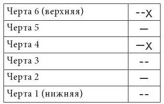 6 – изменяющаяся Инь, переходящая в Ян (записываем прерывистой чертой и отмечаем крестиком: ⚋Х)
