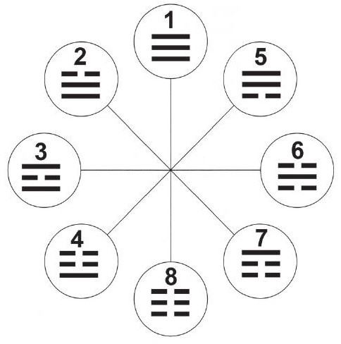 4. Посмотрите, где оказалась помеченная монета. В этом кружке вы найдете нижнюю (внутреннюю) триграмму. Запишите ее.