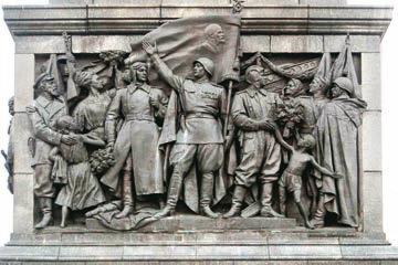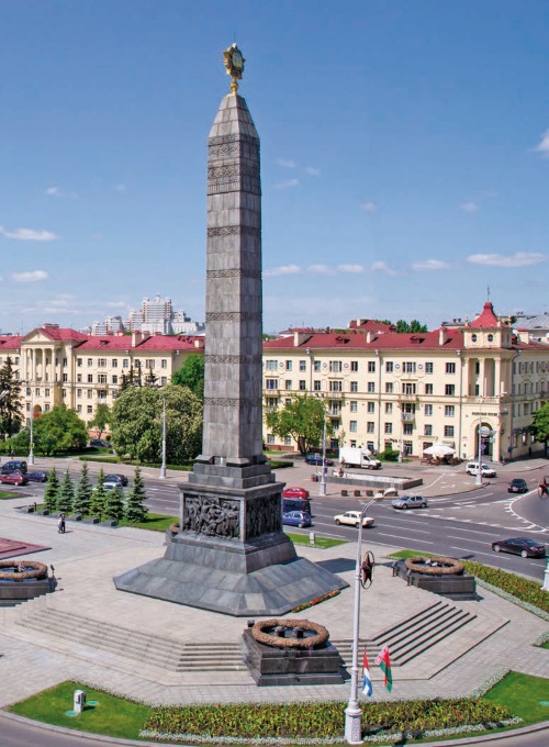В полную меру своего большого таланта в создании столь знакового обелиска участвовали еще четыре мастера. Среди них – великолепный скульптор Заир Исаакович Азгур, как и Заборский с Королем, учившийся во Всероссийской Академии художеств, уроженец Сеннещины, народный художник СССР, Герой Социалистического Труда, дважды лауреат Государственной премии СССР, которая в то время, когда он ее получал, называлась Сталинской. Это его руками изваян Якуб Колас, всего в нескольких сотнях метров от монумента Победы навсегда присевший на камень в центре столичной площади, названной его же именем. Имя Азгура носит и одна из улиц в Минске. В этом же ряду выпускник Витебского художественного техникума и опять же Академии художеств в Ленинграде народный художник БССР скульптор Андрей Онуфриевич Бембель из смоленского городка Велиж. Еще до войны он создал рельефы для Дома правительства и Дома офицеров в Минске, строившихся по проектам выпускника и преподавателя все той же Академии художеств уже легендарного в Беларуси Иосифа Григорьевича Лангбарда. Позже А. О. Бембель с В. А. Королем стали соавторами мемориального комплекса «Брестская крепость-герой». Рядом с ними – питомцы Витебского художественного техникума. Один из них – уроженец Оршанщины народный художник БССР, лауреат Ленинской премии скульптор Сергей Иванович Селиханов, творец памятника Герою Советского Союза юному партизану Марату Казею, установленному в Минске недалеко от оперного театра, а также «Непокоренного человека» на мемориальном комплексе «Хатынь». Второй – тоже народный художник БССР, автор памятника Франциску Скорине в Полоцке скульптор Алексей Константинович Глебов, который, как свидетельствуют энциклопедии, родился в белорусском селе Зверовичи на Смоленщине. Названная четверка мастеров искусств создала бронзовые горельефы для монумента Победы, размещенные на четырех гранях постамента: «9 мая 1945 г.» – А. О. Бембель, «Слава погибшим героям» – 3. И. Азгур, «Советская армия в годы Великой Отечественной войны» – С. И. Селиханов, «Партизаны Белоруссии» – А. К. Глебов. Приведенное перечисление показывает, что сошлись эти творцы на одном проекте, скорее всего, совсем не случайно. Их объединяла одна школа и ею привитый высокий вкус. Четверо из них – Г. В. Заборский, B. А. Король, 3. И. Азгур и А. О. Бембель – учились в Академии художеств в Ленинграде. Причем Король, Азгур и Бембель до Академии занимались в Витебском художественном техникуме, который фактически находится под ее опекой. Тот же техникум закончили C. И. Селиханов и А. К. Глебов. Теперь на здании, где размещалось это учебное заведение, у истоков которого в 1919 году стояли Марк Шагал, Мстислав Добужинский, Казимир Малевич, Юдель Пэн, именовавшееся в разное время то училищем, то техникумом, установлено пять мемориальных досок. Четыре из них посвящены тем, в чьей творческой биографии значится и монумент Победы в Минске – 3. И. Азгуру, А. О. Бембелю, В. А. Королю, С. И. Селиханову. А имя Глебова нынче носит уже столичный государственный художественный колледж, который является преемником техникума в Витебске. Замыкают плеяду создателей обелиска строители, материализовавшие выдающийся проект. Притом не только белорусские, но и украинские. Жаль, что на площади нет таблички, напоминающей об этом.