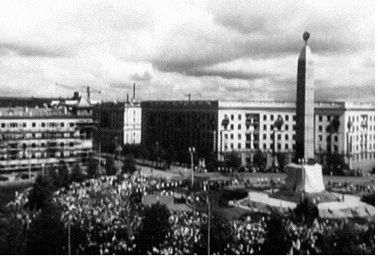 Отчеты об открытии монумента, помещенные в республиканских газетах за вторник 6 июля, были одинаковыми: все опубликовали на первых страницах текст, подготовленный Белорусским телеграфным агентством – БЕЛТА. В сообщении говорилось: «4 июля тысячи трудящихся Минска собрались на Круглой площади на митинг, посвященный открытию памятника обелиска воинам Советской Армии и партизанам, погибшим в борьбе за освобождение Белоруссии от немецко-фашистских оккупантов. Сюда пришли рабочие, служащие, ученые, школьники, воины Советской Армии и бывшие партизаны…». Их пока не называли ветеранами, так как многим еще не исполнилось и тридцати, а уж тем более сорока, в чем легко убедиться в ходе просмотра документального фильма. Было воскресенье. Они пришли на праздник.