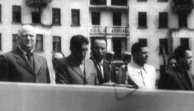 Рядом с ним – председатель правительства БССР К. Т. Мазуров. Крайний слева – секретарь ЦК КПБ Т. С. Горбунов. Кадр из документального фильма