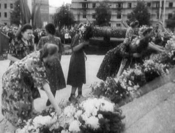 Сразу после открытия монумента Победы. Цветы уже со всех сторон обелиска. Кадр из документального фильма
