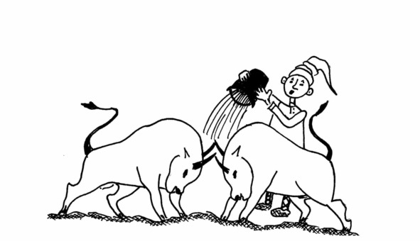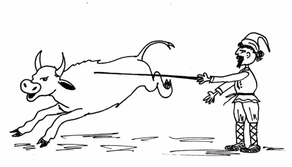 За мною гнался по пятам разъяренный бык,За то, что я корове показал язык.«Гнаться по пятам». Такое выражение говорится тогда, когда кто-либо преследует кого-либо, не отставая.