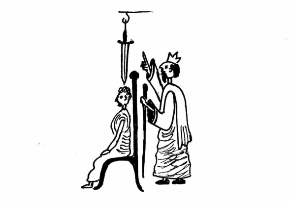 Это выражение связывают с древнегреческим преданием о ДАМОКЛОВОМ МЕЧЕ: Дамокл позавидовал царю Дионисию, и тот решил проучить своего приближённого, посадив его на свой трон и повесив над ним острый меч. Меч символизировал все те опасности, которые ежедневно грозят царю. Дамокл, сидя на троне, поднял голову и увидел, что над ним на тонком конском волоске висит тяжёлый меч, готовый сорваться в любую минуту. Так Дионисий показал своему завистнику, что жизнь царя всегда сопряжена с опасностью и висит как меч на волоске. Дамокл понял, как мало счастлив тот, кто находится под вечным страхом.