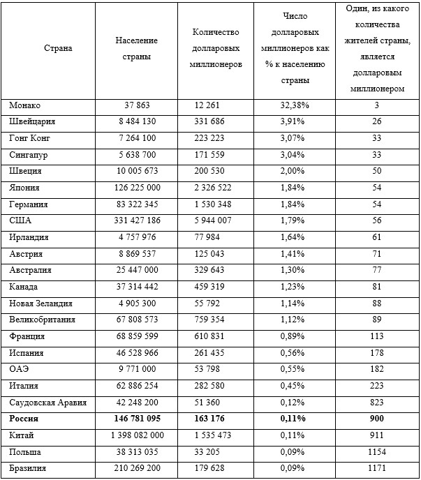 Анализируя данные цифры, можно сделать вывод о том, что в среднем в развитых странах примерно 1–2% населения являются долларовыми миллионерами, то есть примерно каждый 50-100-ый житель.