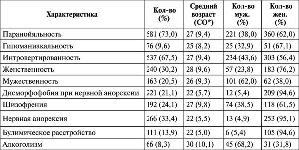Из историй болезни пациентов (независимый диагноз психиатра) была получена информация о наличии у некоторых из них следующих психических заболеваний: шизофрении, нервной анорексии (ограничительный вариант), булимического расстройства (как самостоятельное заболевание и вариант или этап в развитии нервной анорексии) и алкоголизма, а также дисморфофобического расстройства тела (в рамках нервной анорексии). Психические заболевания были диагностированы психиатрами с помощью ранее валидизированной Международной статистической классификации болезней и проблем, связанных со здоровьем (МКБ-10, 1994) [66], которая в части описания психических расстройств, в свою очередь, была создана на основе «Руководства по диагностике и статистике психических расстройств» (DSM-IV, 1994), разработанного американской ассоциацией психиатров.