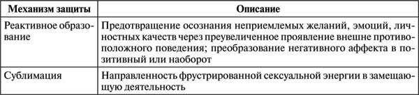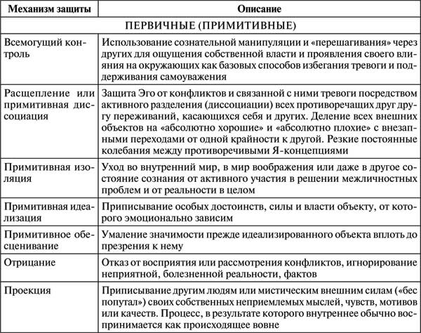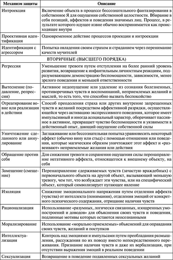 Проведенное сравнительное исследование присутствия в экспериментальном материале теста параметров рисунка и рассказа, положительно связанных с открытой агрессивностью, у пациентов с различными эмоционально-личностными нарушениями выявило наименьшее их присутствие при демонстративности (21,43 %), депрессии (26,47 %), интроверсии (37,43 %), тревожнофобических нарушениях (38,13 %), а наибольшее – при социопатичности (76,17 %), гипоманиакальности (65,79 %), паранойяльности (48,88 %) (Приложение 3, табл. П7). Полученные результаты согласуются с данными клинических и психоаналитических исследований и, по-видимому, объясняются теми защитными механизмами, которые по преимуществу используют пациенты с разными типами организации характеров. Как известно, истерические личности склонны вытеснять свою агрессию, интровертированные и обсессивно-компульсивные – изолироваться от нее, а депрессивные – обращать ее против себя и таким образом осуществлять «контроль» над проявлением агрессии вовне. Использование этих защитных механизмов часто связано с имеющимся у этих пациентов внутренним «запретом» на открытое проявление собственной агрессии и особенно на значимые объекты. Социопатические и гипоманиакальные лица испытывают трудности при контролировании своего гнева, им свойственно импульсивное «отреагирование вовне», а паранойяльные – склонны прибегать к использованию защиты в виде «идентификации с агрессором», тем самым также разрешая себе открытое проявление агрессии вовне. В табл. 5 представлены защитные механизмы личности, описанные в литературе А. Фрейд, Н. Мак-Вильямс, Р. Карсон, Дж. Батчер и С. Минека, Ж. Лапланш и Ж.-Б. Понталис, О. Кернберг и др. [107, 60, 42, 52, 44].