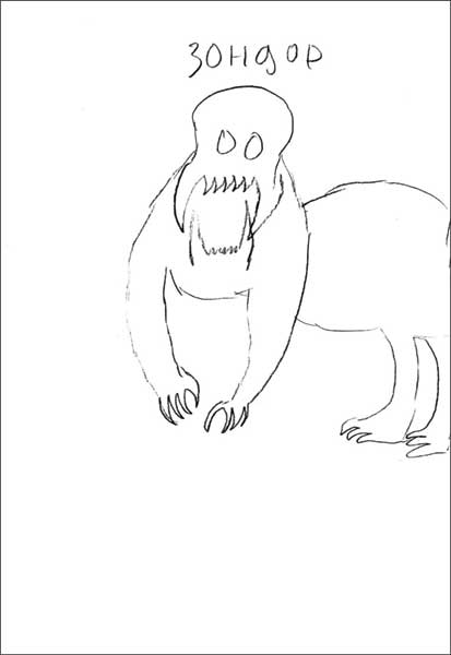 Зондор (рис. 2.2) – нападающее животное. Его длина – 4–5 метров, а высота – 1 метр. Обитает в густых джунглях. Питается животными. Живет в одиночку, сам по себе, как волк. Дружит с себе подобными. Врагами считает все, что движется. Всех животных и более крупных зверей. При нападении на него будет биться зубами, когтями. Сработает его агрессивный инстинкт. Защищен хорошо. Он агрессивен к человеку и не хотел бы, чтобы тот его приручил, так как любит свободу. Человек, может быть, ни мог бы его приручить, если только с детства. Он умный, как волк. Имеет дикий свободолюбивый нрав, инстинкт хищника. Мне он не нравится. Мутант какой-то. Не нравится необычность, несопоставимость в его облике. Туловище как у животного, а голова как у монстра. Голова некрасивая, похожа на человеческую, не подходит к звериному облику. Мне нравится в нем дерзость, отвага, сила физическая и внутренняя. И еще грандиозность его размеров и внешнего вида в целом. Маме бы он не понравился. Особенно его отпугивающий внешний вид. Папе бы тоже не понравился. Может, понравилась бы только его мощь. И старшему брату он бы не понравился. В первую очередь не понравилось бы несоответствие его головы и туловища.