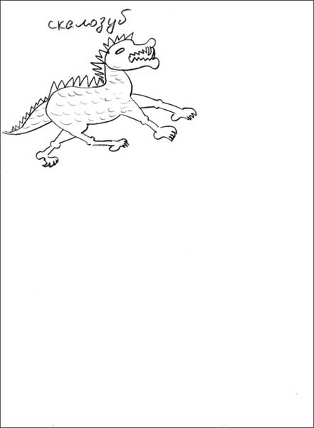Скалозуб (рис. 2.3) – это нападающее животное, хищник. Его длина 6 метров, а высота 2 метра. Обитает в тропических джунглях. Питается мясом животных и фруктами на закуску. Живет семьями. Контактирует с себе подобными. Но контакты – это драки за дележ пищи или самки в брачный период. То есть все эти контакты драчливые. Его врагами являются более крупные хищники или такие же, как он, за среду обитания. Защищается когтями, зубами и еще у него есть чешуя и роговые отростки на спине. Защищен нормально, но только ноги и голова хуже. Он охотится на людей, как на других животных, и люди его боятся. Человек не может его приручить, так как он слишком дикий. И нет пользы от него, его мясо не жирное… Сердце его тоже чешуей защищено, и другие органы. Это хитрое животное, как волк. Нрав его агрессивный. Скалозуб мне не нравится тем, что злой и агрессивный, не нравится оскал зубов, чешуя и роговые отростки. Внешний облик его безобразный. Однако и красота есть. Это мускулистые части тела, его ноги. Он хорошо бегает. Нравится также, что это умное животное, знает, как добыть пищу, создать семью, как отогнать противника. Маме и сестре он бы не понравился. Особенно его зубы, оскал, чешуя и роговые отростки. Но могла бы понравиться его хитрость и сообразительность.
