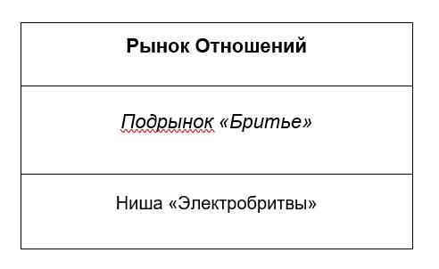 Простой пример. Человек хочет побриться. Зачем? Хочет выглядеть приятно для семьи, коллег, для общества. Ради хороших отношений. То есть на рынке отношений существует подрынок бритья. А на каждом подрынке есть ниша – конкретный способ удовлетворения потребности. Кто-то будет использовать электрическую бритву, кто-то – бритву с лезвием, а кто-то сделает эпиляцию.