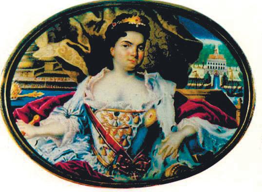 Мусикийский Г. С. Портрет Екатерины I на фоне Екатерингофского дворца в Петербурге. 1724. Финифть. ГЭ