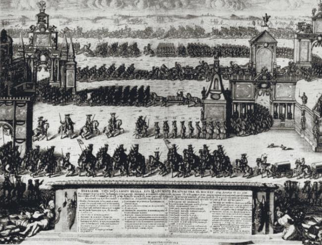 Зубов А. Ф. Торжественный вход русских войск в Москву после Полтавской победы. 1711. Офорт