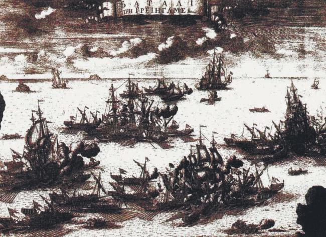 Другое композиционное решение имеет «Баталия при Гренгаме». Здесь сражение показано во всей полноте и разворачивается на широком водном пространстве с четко обозначенной линией горизонта, обрамленной причудливыми облаками. Возвышенный ракурс и панорамный обзор не позволяют рассмотреть детали, но придают изображению эпический размах.