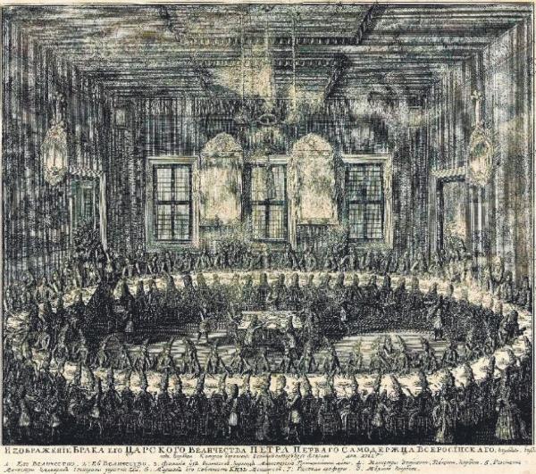 Нельзя считать документальными и событийные гравюры. Как правило, они создавались заранее и являлись частью подготовки торжества. Не случайно на гравюре «Изображение брака Его Царского Величества Петра Первого…который отправлен в Санкт Питеръбурге февраля… 1712-го» не проставлена дата, а цифрами обозначены только обязательные участники – царская чета, принцессы, Меншиков и те немногие лица, чьи места были заранее определены протоколом.