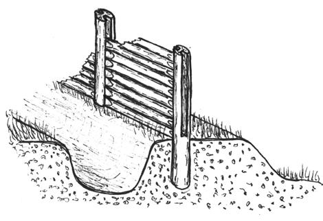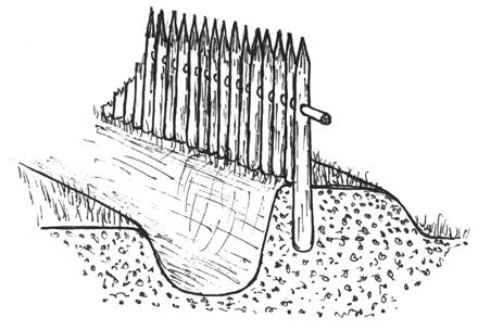 Но такое поселение на мысу было открыто с напольной стороны (фортификационный термин: сторона, выходящая на открытое поле, откуда возможна атака врага), и здесь приходилось создавать искусственные укрепления. Обычно отрывали ров, а вынутой землей насыпали вал. Если конец мыса был низменный, в виде пологого ската, то его тоже могли обносить рвом и валом. Наибольшее значение имели глубокие рвы, особенно если они были наполнены водой из реки или ручья. Валы назывались спом, приспом, переспом (от слова «сыпать»), а позднее – осыпью, и как бы дополняли своими откосами крутые стенки рва. А уже на валу ставились деревянные укрепления. По краю площадки строили частокол (тын) высотой «в два копья», то есть примерно 3–4 метра. Бревна закапывали в землю на глубину примерно в 1 метр и для прочности их закрепляли в основании горизонтальными плахами и бревнами. На расстоянии 30–50 сантиметров от заостренных верхних концов бревен их соединяли горизонтальным брусом, проходившим через отверстия в бревнах, или прибитым к ним. Таким образом, повалить отдельные бревна частокола было очень трудно, даже невозможно. Обычно на частокол шли хвойные деревья диаметром 15–20 сантиметров. Пространство на валу за тыном называлось затином. С внутренней стороны тына делались полати – настил боевого хода защитников, стоявший на коротких вертикальных столбах. Находившиеся на полатях защитники почти на всю высоту своего роста были скрыты тыном, стреляя из луков между заостренными концами бревен или через узкие амбразуры, прорезанные в двух смежных бревнах.
