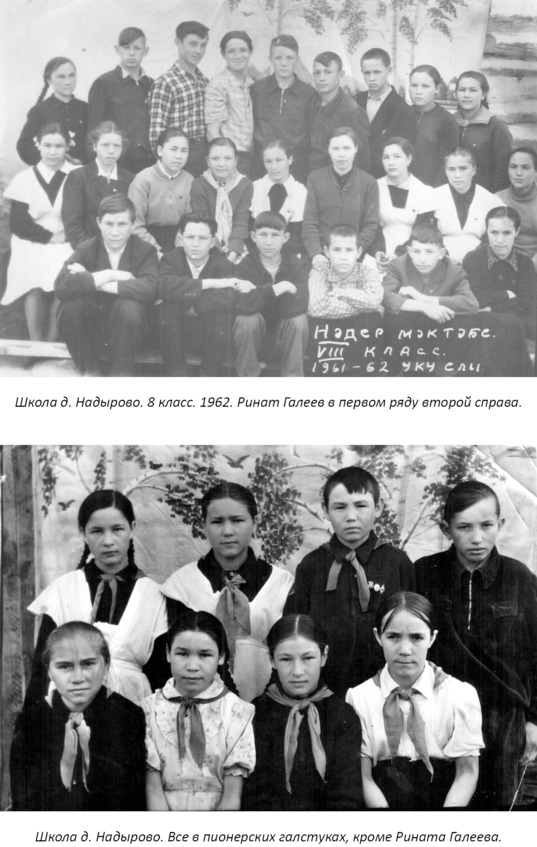 Шакирзянов Рафис Хакимзянович, одноклассник: Мы с Ринатом Галеевым учились в одном классе в Надырово. В Альметьевске с 9 по 11 было три параллельных класса, и нас разделили, но это лишь условности, которые не мешали дружить. Нам повезло учиться в замечательной школе, которая постоянно занимала первые места в городских и республиканских конкурсах. Директор – фронтовик, заслуженный человек Мирза-абы Тагиров. Ринат Галеев выделялся грамотностью, любил математику, да и все предметы ему легко давались. Однажды мы с ним вместе участвовали в олимпиаде. Ринат первым решил задачи, сдал и ушёл, но чертёж по геометрии у него был перечёркнут. Так что в Казань на республиканскую олимпиаду отправили меня. Школу Галеев закончил с серебряной медалью.