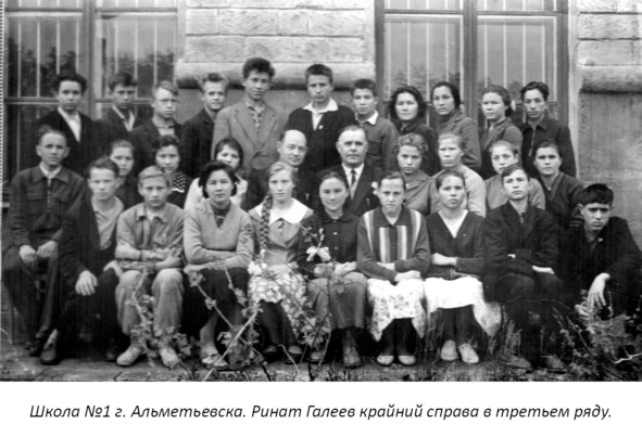 В старших классах Ринат Галеев учился уже не в Надырово, а в Средней общеобразовательной школе №1 г. Альметьевска – старейшей школе города, созданной в 1918 году на базе действующего медресе. Директором её работал вернувшийся с войны Мирза Каюмович Тагиров12, человек принципиальный, но в то же время добрый, заботливый, отзывчивый. Школа при нём была на хорошем счету в республике. Сегодня имя Тагирова присвоено улице, прилегающей к школе. Ринату Галееву общежития не предоставили. Он жил у родственников, а, в конце концов, решил ездить каждый день в Альметьевск из дома. Три километра добирался пешком до Нижней Мактамы, а оттуда в Альметьевск шёл троллейбус. Дорога в один конец занимала часа полтора.