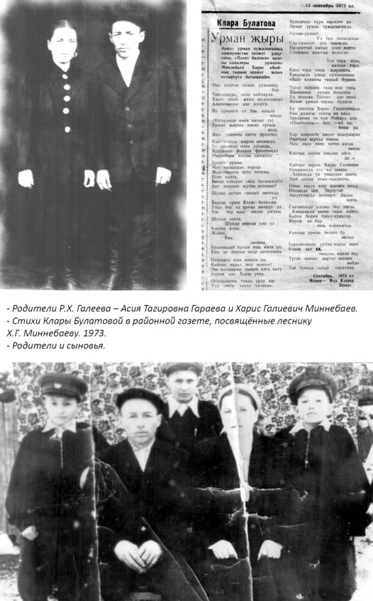 Рим Галиев: От отца мы переняли принципиальность. И я за неё пострадал, и Ринат тоже. Но никогда принципами не поступались. Также по примеру отца, я будучи руководителем, никого зря не наказывал. Если налагал взыскания, то своей властью, не доводил до начальства, не выставлял на всеобщее обозрение. Зачем человеку карьеру портить? Так что, когда вышел на пенсию, на меня никто в обиде не был. Это в крови, отцовское воспитание. Хариса-бабая в деревне уважали за то, что никого под суд не отдал. В те времена же лес воровали. Если он кого ловил, то заставлял скрыть следы преступления и давал задание отработать. Другие лесники долго на месте не держались, а его до сих пор, много лет после смерти, даже молодые знают и помнят.