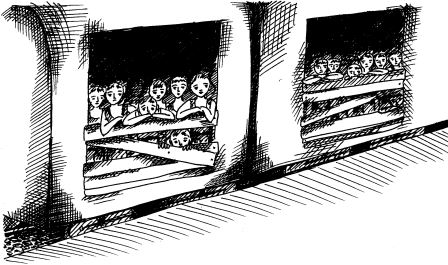 После бани шла по бесконечно длинному коридору, по обе стороны которого выстроились одинаковые двери с номерами. Еще одно колено коридора – и поворот на широкую лестницу. Моя комната на пятом этаже. Она чистая, с большим окном. Шесть кроватей, шесть стульев, стол. На кроватях простыни и пододеяльники настоящие, белые. Одеяла розовые с синими полосками. Потрогала свое: мягкое, не колется. Матрац толстый, ватный. Стены комнаты до половины окрашены светло-зеленой краской, а выше – меловые. Шторы белые в цветочек. Красиво, как в больнице!