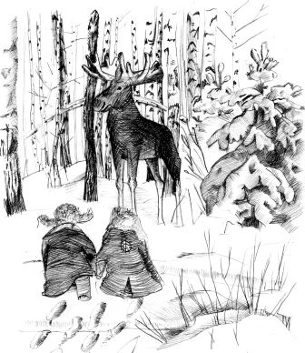 Мы шли достаточно долго, но лось не появлялся. Решили вернуться. Идем, беззаботно болтаем, рассматриваем на снегу следы птиц и мышей. Тут Витек заметил в глубине леса красный куст. Что это? Сошли с дороги и по колено в снегу приблизились к красивому кусту. Барбарис! В этом году он поздно созрел и не успел осыпаться. Я всегда объедалась приятной кислятиной, которая росла у нас за сараем. Ягоды никогда не успевали созреть, так как желающих полакомиться было слишком много. Обрывали барбарис, как только он начинал краснеть. А тут – огромный куст! Мы с Витей сначала наперегонки срывали кисточки с рубиновыми, сочными морожеными ягодами, обсасывали их, сплевывая косточки. Потом стали есть спокойно. Никто же не перехватит, не отнимет! Мы смеялись, глядя на наши залитые соком рожицы. Вкуснее ягод я никогда не ела! Но какими бы сладкими они нам ни казались, одолеть весь куст так и не смогли, – сделалось кисло в животе. Наполнив карманы кисточками ягод для ребят и умыв снегом лицо и руки, отправились домой. Но не успели пройти и несколько шагов, как мимо промчалась лосиха. Она своим телом прикрывала малыша и оттесняла его в кусты. Наверно, это была молодая мамаша. Ее изящная головка с тревожными глазами вытянута вперед. А ноги! Какая грация! Ни одного лишнего движения. Не бег – полет.