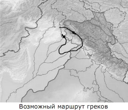 Здесь показан возможный маршрут греков. Стрелки указывают направление движения. Конечно, маршрут мог быть и другой, не между реками Рави и Чинаб, но это не сильно влияет на ход рассуждений. Этот маршрут соответствует тексту Ксенофонта, греки возвращаются через горы к тем местам, где сегодня находят очень много греческих монет, туда, где, скорее всего, находилась древняя Греция.