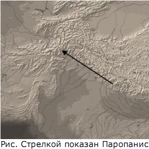 «Паропанис, Парапамис, Паропамис – …см. также Парнас(с); – идентифицируется как нын. горная система Гиндукуш (перс. Хинду Кух – «Индийская гора») в Афганистане, Пакистане и Индии; примыкает к Памиру, Гималаям и хребту Каракорум (= Каракорам, в Кашмире и Китае, к юго-востоку от Памира); центр – 3б°00', 71°30'». [23].