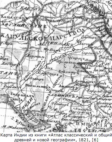 Это главная проблема, поэтому нам предстоит заняться поиском объектов, которых сегодня уже нет. Естественно, никаких утверждений в этом разделе нет, одни версии и предположения. Ниже приведена карта Индии из книги «Атлас классический и общий древней и новой географии», 1821 года. Надо обратить внимание на две реки, одна река впадает в Инд, возле города Агмудпур и другая река, которая вытекает из Инда, чуть ниже. Очевидно, что вторая река, это река Нарра, о которой шла речь в разделе «Вавилон». Видно, что географическая картина в начале ΧІΧ века существенно отличалась от современной картины, сегодня этих двух рек уже нет на картах. И, как уже неоднократно отмечалось, залив Качский раньше соединялся с океаном. Между реками Рави и Сатледж находится еще одна река, которая сегодня отсутствует. Понятно, что в ΧV веке и раньше, как выглядела эта территория можно только догадываться.