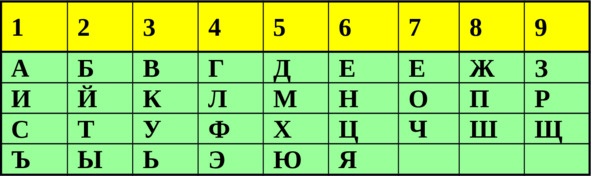 И начнём мы с самого главного – слово «цель». Рассчитаем это слово, опираясь на русский алфавит. Ниже представлена таблица, в которой каждой букве соответствует числовое значение.