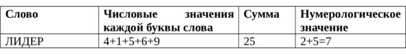 Мы с вами выше разобрали слово «Цель» и пришли к выводу, что это лидерство. Давайте попробуем тем же способом рассчитать слово «Лидер». Кстати, хочу отметить, что все вычисления, которые я произвожу в этой книге, я делаю именно в момент написания книги. Ранее с этими словами я не производила никаких манипуляций. То есть мы с вами, дорогой читатель, делаем открытие практически совместно и одномоментно.