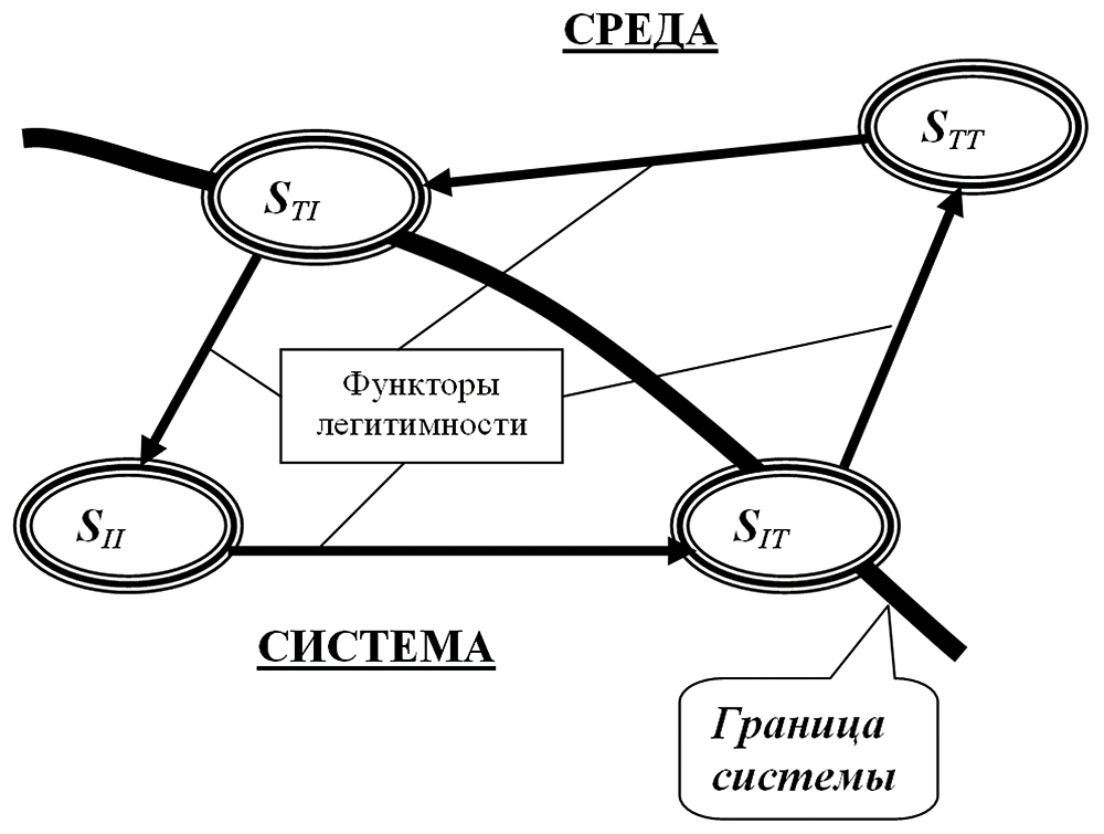 Феноменологическое многообразие модели представления системы на основе композиции представлений внешнего (трансцендентного) и внутреннего (имманентного) наблюдателей. STT – модель внешнего, прагматического восприятия системы трансцендентным наблюдателем (модель «черного ящика»). SII. – непосредственная морфология системы со спецификацией ее объектов и их отношений, определяющая ее внутреннее (имманентное) содержание. Достаточно часто интерпретация этого представления связывается с понятием структуры системы (модель «белого ящика»). STI – взгляд из внешней среды сквозь границу системы с целью реализации необходимого взаимодействия (ассоциируется с архитектурой системы). SIT – «самоощущение» системы по отношению её жизни в окружающей среде, представляющее собой как бы взгляд – модель, изнутри системы сквозь ее границу на внешний мир.