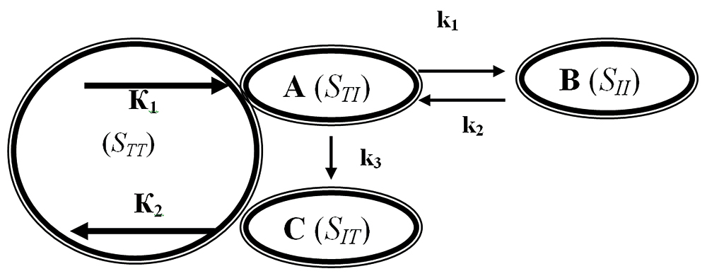 Интерпретация модели простой системы Л.Берталанфи в представлениях феноменологической модели. Компонент А вводится в систему и превращается в результате обратимой реакции в В; одновременно с этим путем необратимой реакции происходит катаболизация и полученный продукт С в конечном счете выводится из системы. К1, К2 – константы ввода и вывода; k1, k2, k3 – константы реакции. Данная модель в общих чертах соответствует, например, протеиновому обмену в живом организме, где А – аминокислоты, В – протеины, С – продукты физиологического выделения.
