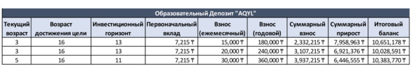 Минимальный вклад, с которого можно начинать, составляет всего 3 МРП (7575 тенге на 2020 год). Необходимо также принять во внимание, что через 15 лет со средним обесценением казахстанского тенге к доллару США в районе 8—9% в год к 2035 году обменный курс доллара США будет колебаться в районе 1500 тенге за доллар. Соответственно, 10 млн тенге, накопленных на вашем депозите к тому времени, будут составлять всего 6300 долларов США. Этой суммы, возможно, будет достаточно, чтобы заплатить за учебу в местном университете, но об учебе в зарубежном вузе с таким бюджетом не может быть и речи. Поэтому важно реально ставить цели. Увлекаться максимальными выплатами, заливая миллионы на депозит, в первое время тоже не стоит, поскольку цель в конце концов является долгосрочной, а доходность по депозиту в перерасчете на доллары не очень высокая (всего 4—5% годовых). Важным преимуществом программы является возможность получения образовательного кредита на недостающую сумму. Конечно, на каких условиях и на сколько этот кредит будет льготным на тот момент, знает только время, однако иметь такую возможность в багажнике на всякий случай не помешает. Необходимо отслеживать изменения в государственных программах и ежегодно корректировать свои цели. Ваши ежемесячные взносы по депозиту AQYL должны как минимум увеличиваться с увеличением максимальной суммы гарантирования вкладов (10 млн на 2020 год). 10 млн на 2020 год – этот тот минимум, на который использование программы обязательно.